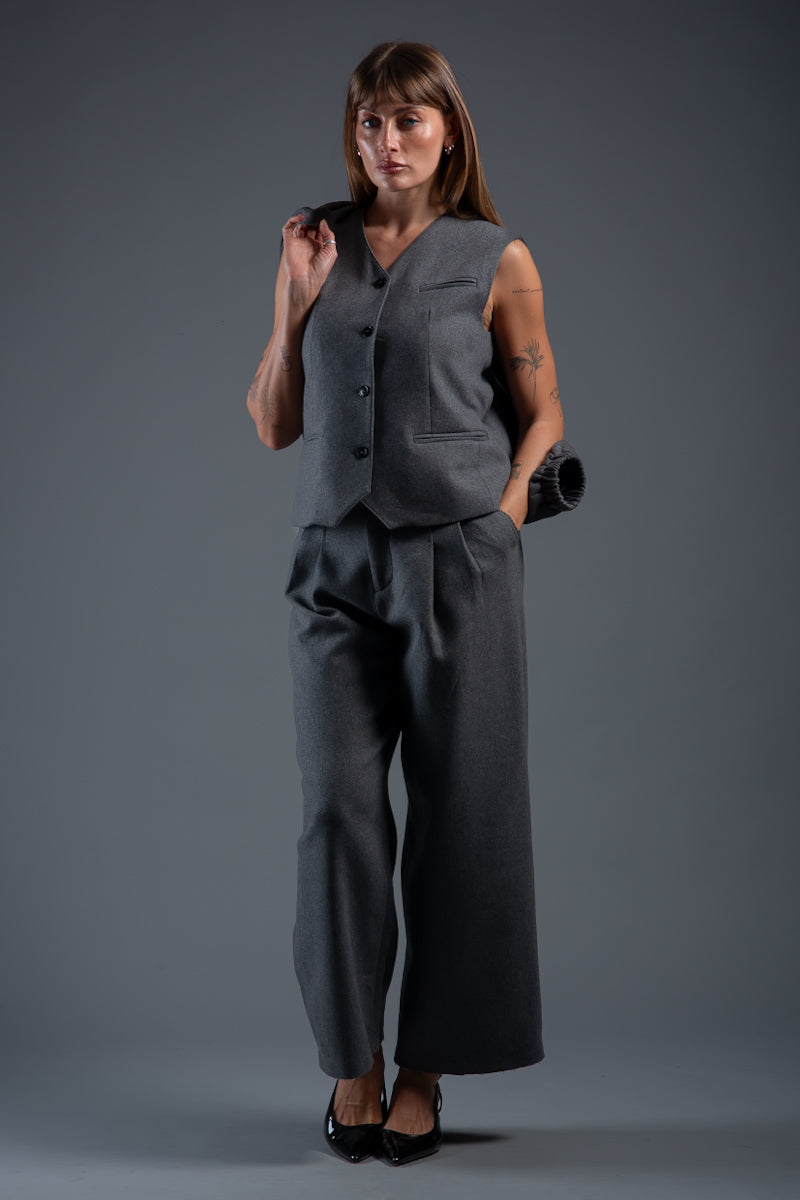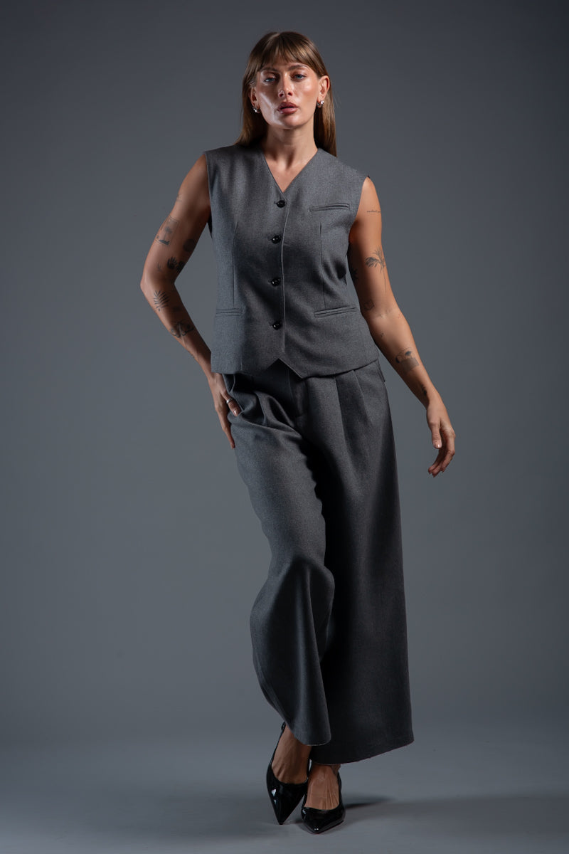 A three-piece wool set featuring a tailored waistcoat with coordinating buttons and refined welt pockets, a clean-cut coat with softly cuffed sleeves and a cuffed lower edge fastened with a single button, and matching trousers finished with a neat button closure.